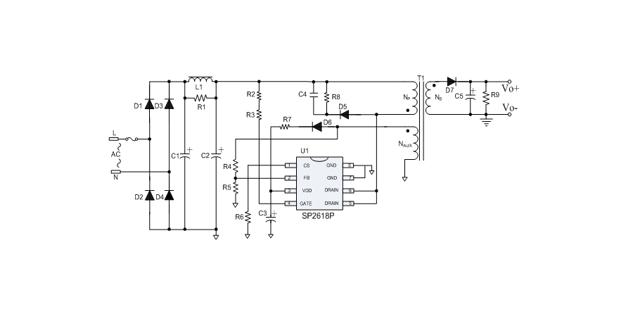 SP2618P提供全面的保護(hù)功能,包括逐周期限流保護(hù)(OCP)、VDD過(guò)壓保護(hù)(OVP)、VDD欠壓保護(hù)(UVLO)、反饋環(huán)路開(kāi)路保護(hù)、輸出短路保護(hù)、輸出過(guò)壓保護(hù)、過(guò)溫保護(hù)等。其中,輸出短路保護(hù)、輸出過(guò)壓保護(hù)具有自動(dòng)重啟恢復(fù)的功能。