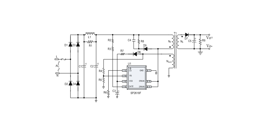 SP2618F是一款性能優(yōu)異的原邊反饋控制電路,應(yīng)用于小功率AC/DC充電器與適配器??刂齐娐肥褂迷叢蓸蛹夹g(shù)進(jìn)行精確的恒流、恒壓控制,可以省去一般應(yīng)用中的光耦與TL431。