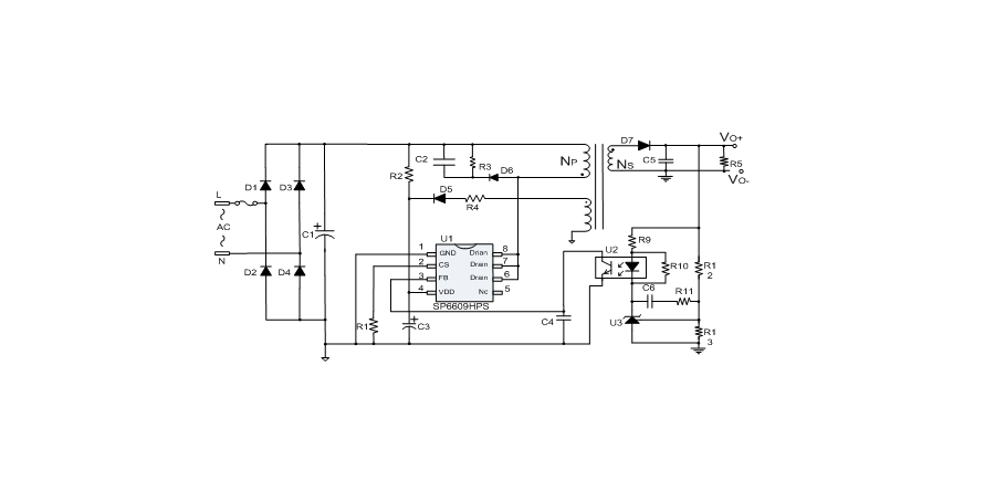 SP6609HPS內(nèi)置多種保護(hù),包括逐周期限流保護(hù)(OCP),過載保護(hù)(OLP),過壓保護(hù)(OVP),VDD過壓箝位,欠壓保護(hù)(UVLO),過溫保護(hù)(OTP)等,通過內(nèi)部的圖騰柱驅(qū)動(dòng)結(jié)構(gòu)可以更好的改善系統(tǒng)的EMI特性和開關(guān)的軟啟動(dòng)控制。