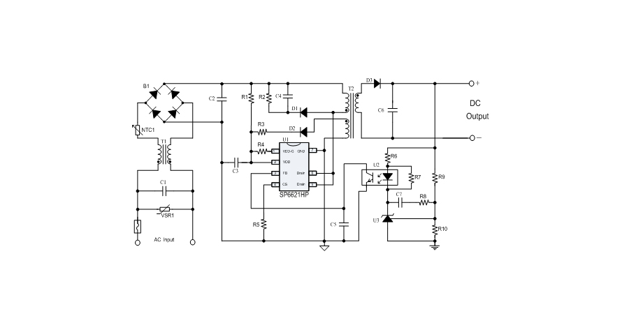 SP6621HP在PWM模式下工作于固定頻率,這個(gè)頻率是由內(nèi)部精確設(shè)定的。在空載或者輕載時(shí),工作頻率由IC內(nèi)部調(diào)整。芯片可以工作在綠色模式,以此來減小輕載時(shí)的損耗,提高整機(jī)的工作效率,SP6621HP在啟動(dòng)和工作時(shí)只需要很小的電流,可以在啟動(dòng)電路中使用一個(gè)很大的電阻,以此來進(jìn)一步減小待機(jī)時(shí)的功耗。芯片內(nèi)置有斜坡補(bǔ)償電路,當(dāng)電路工作于大占空比時(shí),避免次諧波振蕩的發(fā)生,改善系統(tǒng)的穩(wěn)定性。內(nèi)置有前沿消隱時(shí)(Leading-edge blanking time),消除緩沖網(wǎng)絡(luò)中的二極管反向恢復(fù)電流對電路的影響。SP6621HP采用了抖頻技術(shù),能夠有效改善系統(tǒng)的EMI性能。系統(tǒng)的跳頻頻率設(shè)置在音頻(20KHz)以上,在工作時(shí)可以避免系統(tǒng)產(chǎn)生噪音。SP6621HP內(nèi)置多種保護(hù),包括逐周期限流保護(hù)(OCP),過載保護(hù)(OLP),過壓保護(hù)(OVP),VDD過壓箝位,欠壓保護(hù)(UVLO),過溫保護(hù)(OTP)等,通過內(nèi)部的圖騰柱驅(qū)動(dòng)結(jié)構(gòu)可以更好的改善系統(tǒng)的EMI特性和開關(guān)的軟啟動(dòng)控制。SP6621HP使用DIP7無鉛封裝。