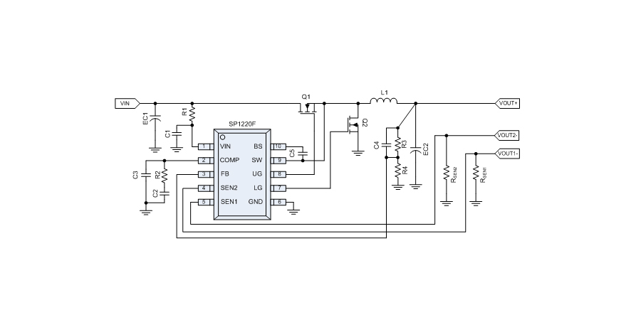 SP1220F是一款同步降壓型PWM控制器,該控制器可驅(qū)動雙路輸出8A(4A+4A)負(fù)載電流。設(shè)計允許SP1220F在9V到40V寬輸入電壓范圍內(nèi)工作。通過將COMP/EN引腳邏輯電平拉低來實現(xiàn)外部關(guān)斷功能,并進(jìn)入待機(jī)模式。外部補償使反饋控制環(huán)路具有良好的線壓調(diào)整率和負(fù)載調(diào)整率,且外圍設(shè)計靈活。