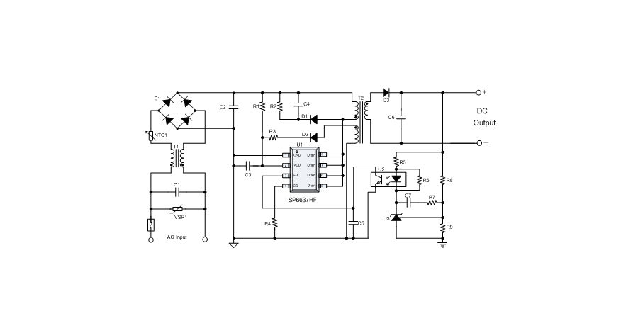 SP6637HF是一顆電流模式PWM控制芯片,內(nèi)置功率MOSFET,用于功率在15W以內(nèi)的方案。該芯片在系統(tǒng)輸出空載時(shí)工作在跳頻模式,在系統(tǒng)輸出輕載到中等負(fù)載階段工作在PFM模式,在輸出重載時(shí)工作在最大恒定工作頻率。SP6637HF的啟動(dòng)電流和工作電流設(shè)定的比較小,以此減小待機(jī)時(shí)的功耗。芯片內(nèi)置有斜坡補(bǔ)償電路,避免次諧波振蕩的發(fā)生,改善系統(tǒng)的穩(wěn)定性。芯片內(nèi)置有前沿消隱時(shí)間(Leading-edge blanking time),消除緩沖網(wǎng)絡(luò)中的二極管反向恢復(fù)電流對(duì)電路的影響。該芯片帶有抖頻功能,能夠有效改善系統(tǒng)的EMI性能。芯片最低的工作頻率設(shè)置在音頻以上,在工作時(shí)可以避免系統(tǒng)產(chǎn)生噪音。SP6637HF內(nèi)置多種保護(hù),包括逐周期限流保護(hù)(OCP),過(guò)壓保護(hù)(OVP),VDD過(guò)壓箝位,欠壓保護(hù)(UVLO),過(guò)溫保護(hù)(OTP)等,通過(guò)內(nèi)部的圖騰柱驅(qū)動(dòng)結(jié)構(gòu)可以更好的改善系統(tǒng)的EMI特性和開(kāi)關(guān)的軟啟動(dòng)控制。