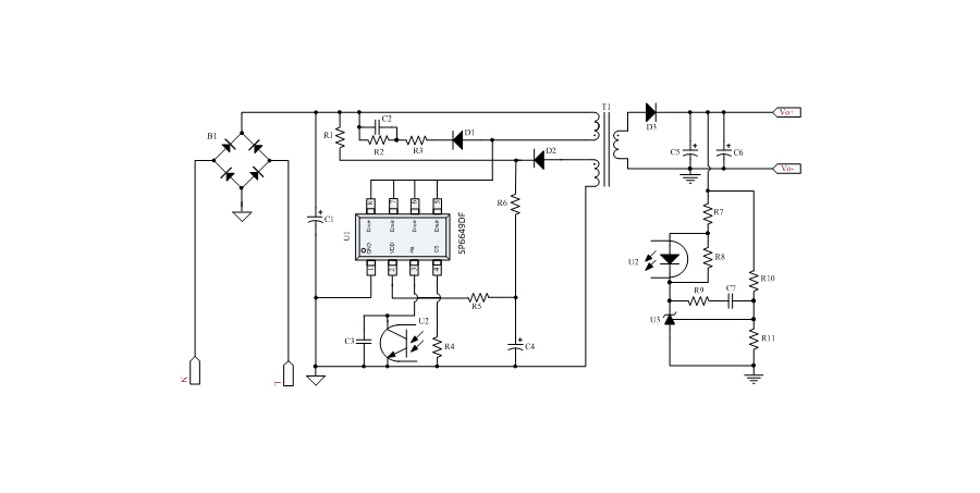 SP6649DF內(nèi)置多種保護(hù),包括逐周期限流保護(hù)(OCP),過載保護(hù)(OLP),過壓保護(hù)(VDD OVP),VDD過壓箝位,欠壓保護(hù)(UVLO),過溫保護(hù)(OTP)等,通過內(nèi)部的圖騰柱驅(qū)動(dòng)結(jié)構(gòu)可以更好的改善系統(tǒng)的EMI特性和開關(guān)的軟啟動(dòng)控制。