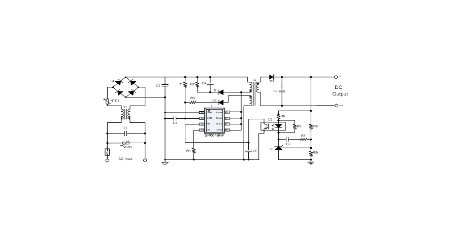 SP6649HF是一顆電流模式PWM控制芯片,內(nèi)置650V高壓功率MOSFET,應(yīng)用于功率在30W以內(nèi)的方案。SP6649HF在PWM模式下工作于固定開關(guān)頻率,這個頻率是由內(nèi)部精確設(shè)定。在空載或者輕載時,工作頻率由IC內(nèi)部調(diào)整。芯片可以工作在綠色模式,以此來減小輕載時的損耗,提高整機的工作效率。SP6649HF在啟動和工作時只需要很小的電流,可以在啟動電路中使用一個很大的電阻,以此來進一步減小待機時的功耗。芯片內(nèi)置有斜坡補償電路,當(dāng)電路工作于大占空比時,避免次諧波振蕩的發(fā)生,改善系統(tǒng)的穩(wěn)定性。內(nèi)置有前沿消隱時(Leading-edge blanking time),消除緩沖網(wǎng)絡(luò)中的二極管反向恢復(fù)電流對電路的影響。SP6649HF采用了抖頻技術(shù),能夠有效改善系統(tǒng)的EMI性能。系統(tǒng)的跳頻頻率設(shè)置在音頻(22KHz)以上,在工作時可以避免系統(tǒng)產(chǎn)生噪音。SP6649HF內(nèi)置多種保護,包括逐周期限流保護(OCP),過載保護(OLP),過壓保護(VDD OVP),VDD過壓箝位,欠壓保護(UVLO),過溫保護(OTP)等,通過內(nèi)部的圖騰柱驅(qū)動結(jié)構(gòu)可以更好的改善系統(tǒng)的EMI特性和開關(guān)的軟啟動控制。