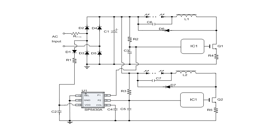 SP5430A是一款雙電源LED開(kāi)關(guān)調(diào)色/調(diào)光專(zhuān)用控制電路,適用于85VAC~265VAC全電壓應(yīng)用,可以兼容隔離與非隔離架構(gòu)的多種LED驅(qū)動(dòng)方案。SP5430A利用傳統(tǒng)墻壁開(kāi)關(guān)實(shí)現(xiàn)調(diào)色/調(diào)光功能,用戶無(wú)需改造原有的照明開(kāi)關(guān)控制系統(tǒng)。
