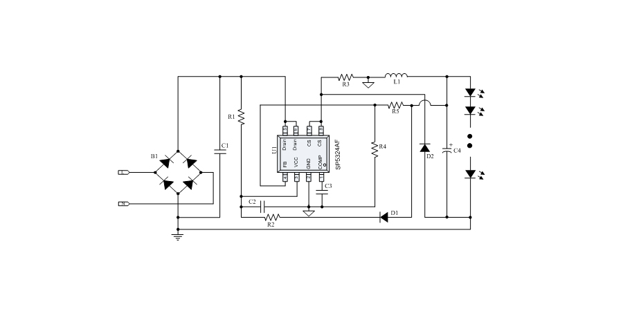 SP5324AF是一款非隔離降壓型單級PFC高性能LED照明轉換電路,內(nèi)置550V高壓MOSFET,具有應用外圍器件極少,設計簡單,功率因數(shù)高,恒流精度高等優(yōu)點。采用準諧振開啟的控制方式,提升了轉換效率。外圍應用采用浮地架構,實現(xiàn)對電感電流進行全周期采樣,得到極高的恒流精度。