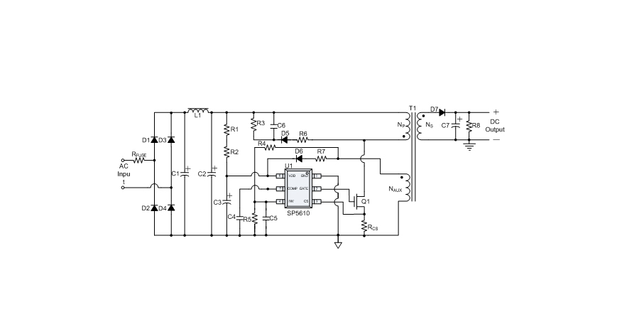 SP5610是一顆高精度離線式開(kāi)關(guān)電源電路,應(yīng)用于低功耗AC/DC充電器與適配器。SP5610使用原邊取樣來(lái)進(jìn)行精確的恒流、恒壓控制,可以省去一般應(yīng)用中的光耦與TL431。