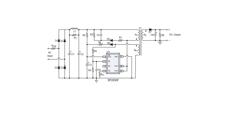 SP2655 提供全面的保護(hù)功能,包括逐周期限流保護(hù)(OCP)、VDD 過(guò)壓保護(hù)(OVP)、VDD 欠壓保護(hù)(UVLO)、反饋環(huán)路開(kāi)路保護(hù)、輸出短路保護(hù)、輸出過(guò)壓保護(hù)、過(guò)溫保護(hù)等。其中,輸出短路保護(hù)、輸出過(guò)壓保護(hù)具有自動(dòng)重啟恢復(fù)的功能。